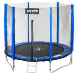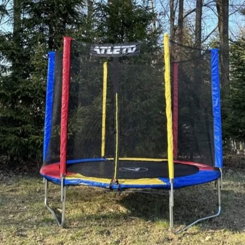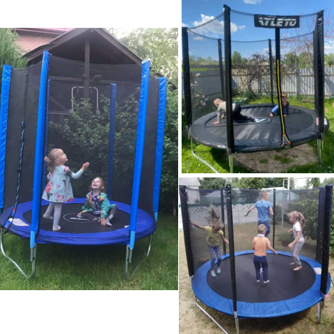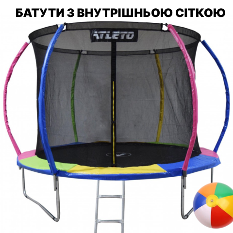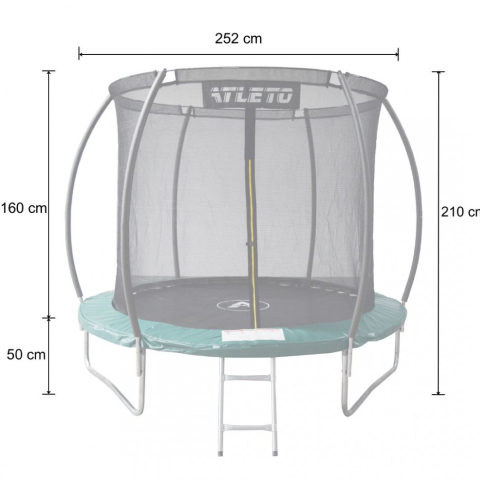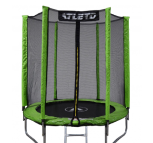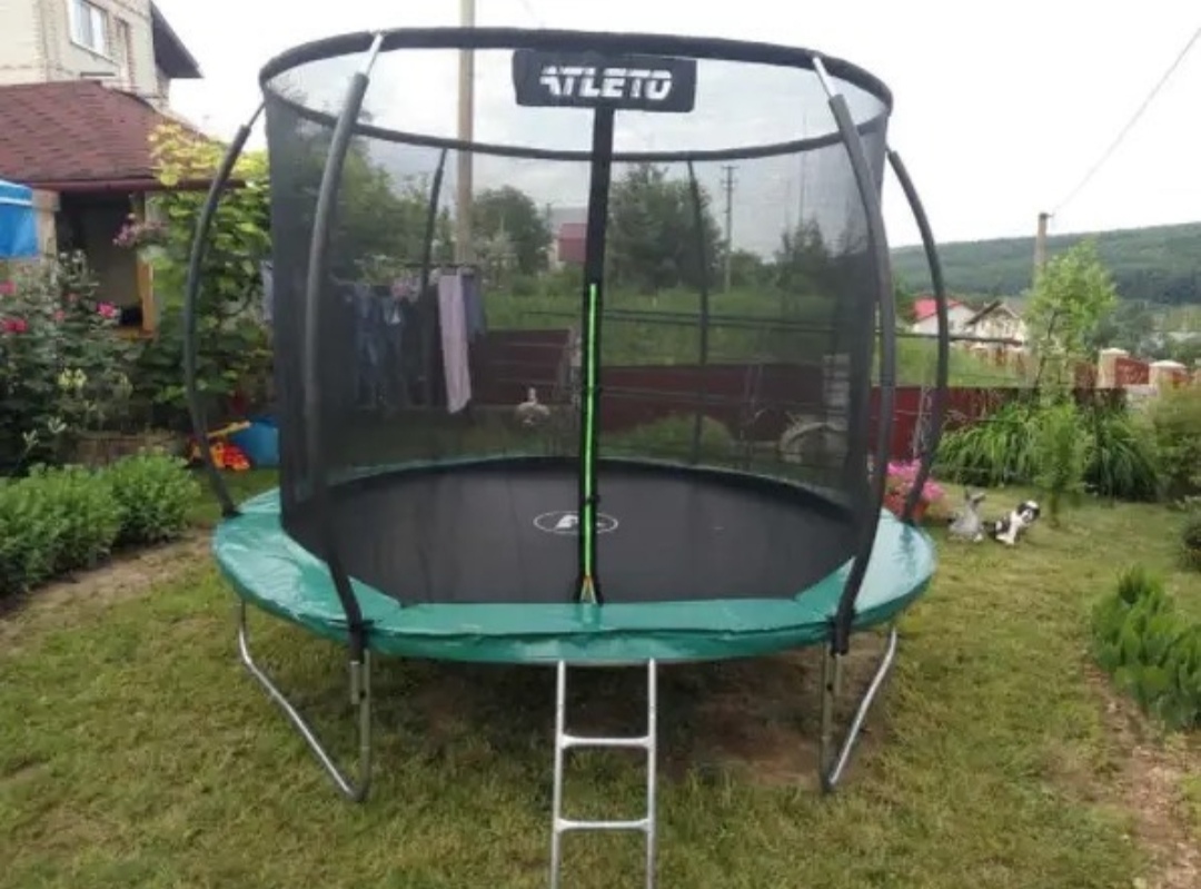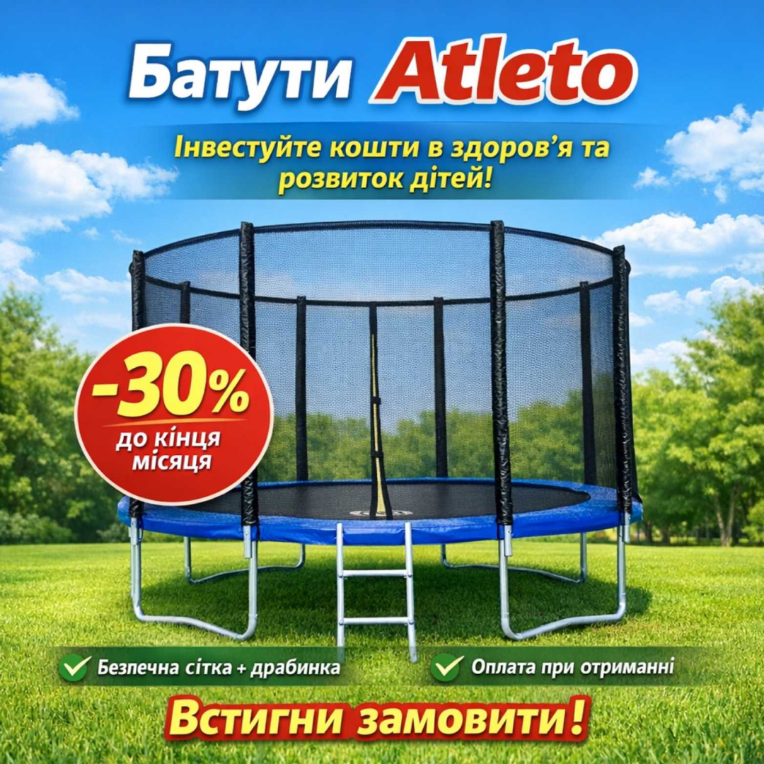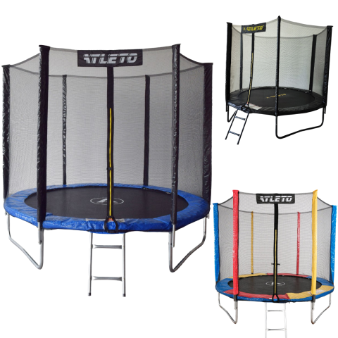 Батут Atleto виготовлений з високоякісних матеріалів (стійких до УФ). Оснащений 36 оцинкованими пружинами, закритими спеціальним прокладним матеріалом. Поверхня оточена захисною сіткою на блискавці.